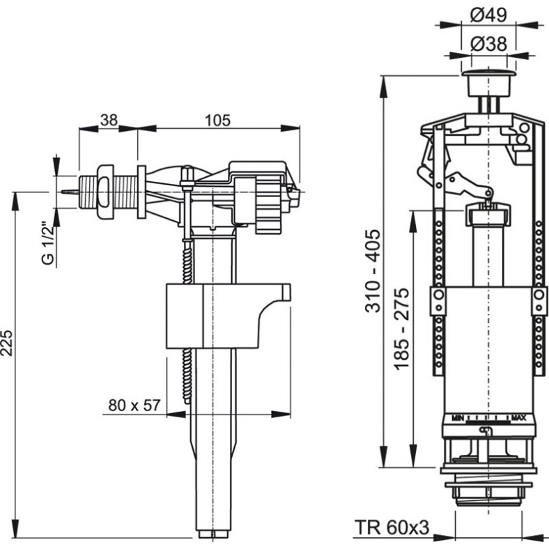 Сливной механизм A2000 с функцией старт/стоп, регулирвокой по высоте от 310 до 405 мм. Впускной механизм с боковым подводом воды, со съемным фильтром для защиты от крупных загрязнений, с соединительной пластиковой резьбой на 1/2" (пол дюйма), длиной 38 мм.
