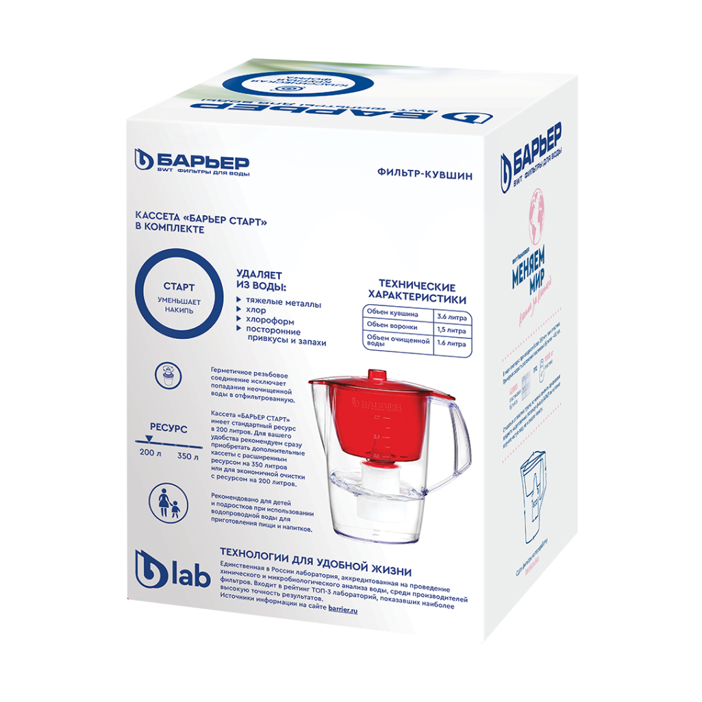 Кувшин классической формы для небольшой семьи. Воронка автоматически откидывается при наклоне кувшина. Конструкция носика защищает воду от попадания пыли. Кувшин можно мыть в посудомоечной машине. В комплекте с кувшином идет стартовая кассета "БАРЬЕР Старт". Умягчает воду, защищает от хлора, тяжелых металлов и других вредных примесей.