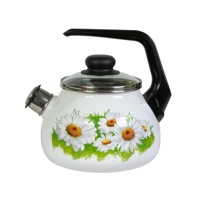 Чайник эмалированный "Ромашки " 3 л. со свистком, сферической формы с консольной фиксированной ручкой из термостойкого пластика, стеклянной крышкой с пластмассовой ручкой-кнопкой, ободок из нержавеющей стали.