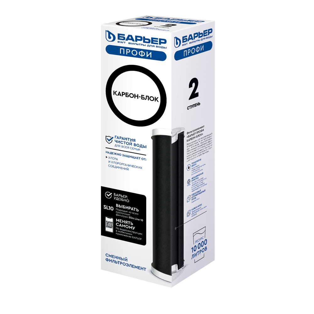 Барьер Профи Карбон-блок - картридж для доочистки воды от хлора и хлорорганики, фенольных соединений и механических примесей. Улучшает вкусовые качества и запах воды. Используется в качестве второй ступени в фильтре Барьер Профи Стандарт и в качестве четвертой ступени в фильтре Профи Осмо 600.