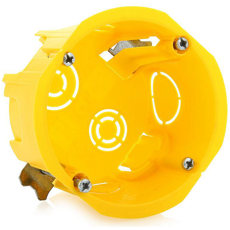 Монтажная коробка круглой формы, глубиной 45 мм, изготовлена из пластика, ярко-желтого цвета. Без крышки. Одномодульный. Фиксируется посредством винта и распорных лапок. Для открытого монтажа электроустановочных изделий (выключатель, розетка и др.).