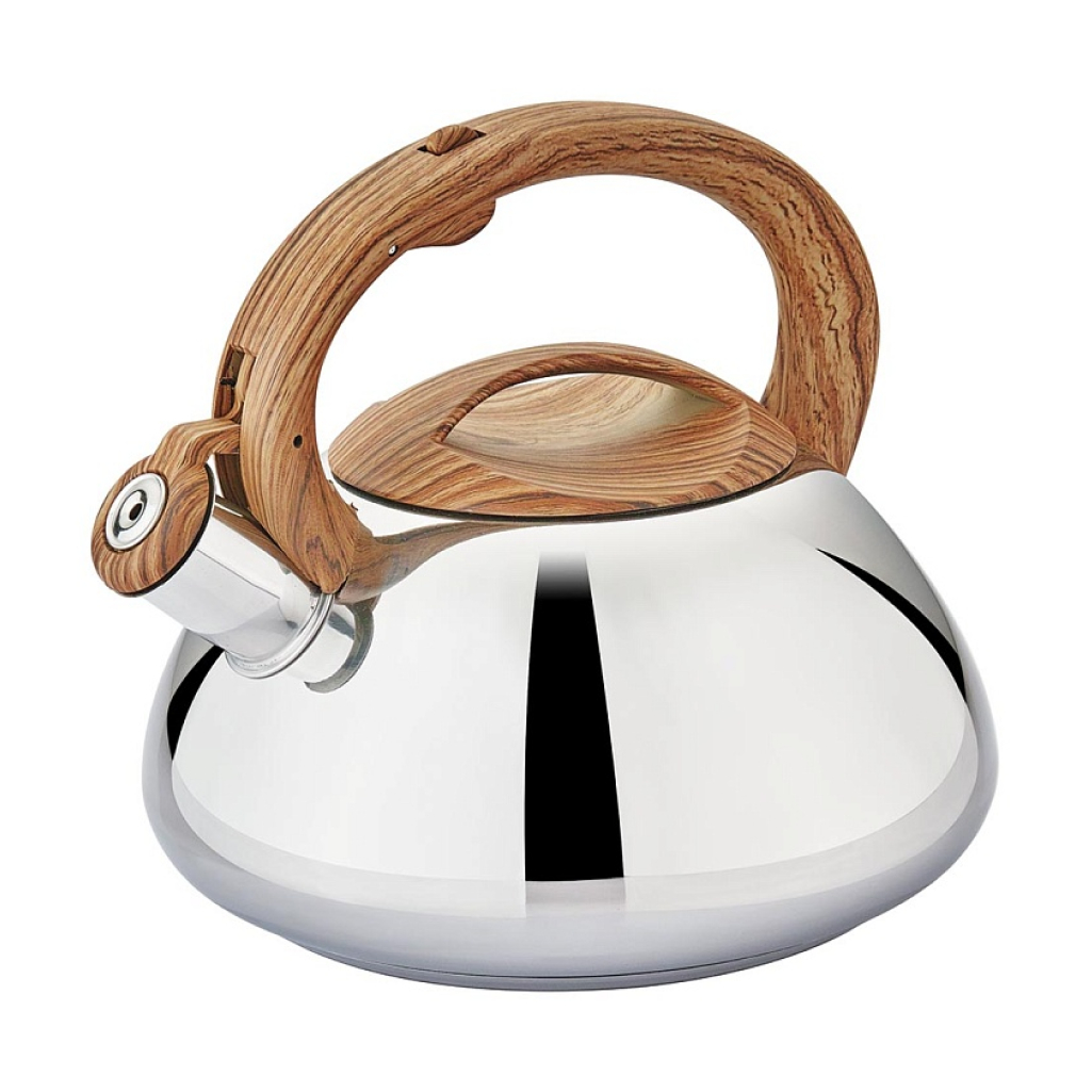 Данная модель чайника объемом 3 литра со свистком подходит для всех видов плит, включая индукционные. Изделие выполнено из высококачественной нержавеющей стали, что гарантирует долговечность и прочность даже при ежедневном использовании. Чайник оснащен удобной фиксированной ручкой цвета "дерево" с кнопкой открывания носика.