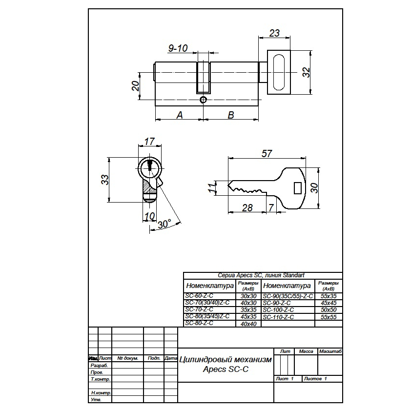 Цилиндровый механизм (личинка) Apecs SM-100(45/55)-NI, никель