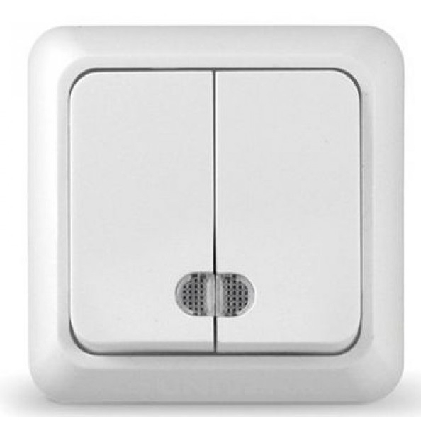 Выключатель Олимп 2-клавишный с подсветкой открытой остановки, белый
