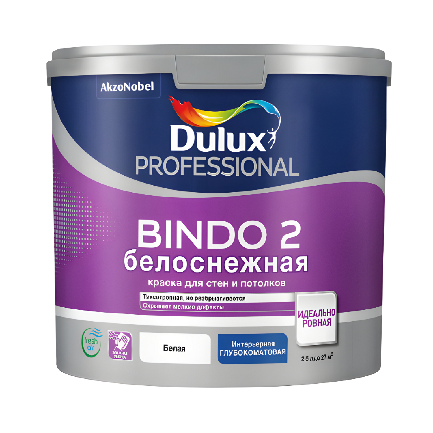 Глубокоматовая водно-дисперсионная краска Dulux Bindo 2 повышенной белизны для высококачественной отделки потолков и стен. Оптимальное открытое время помогает создать идеально ровную поверхность. Тиксотропная: наносится без брызг и потеков, легко разравнивается; с нейтральным запахом. Экологичность подтверждена эко-сертификатом "Листок Жизни".