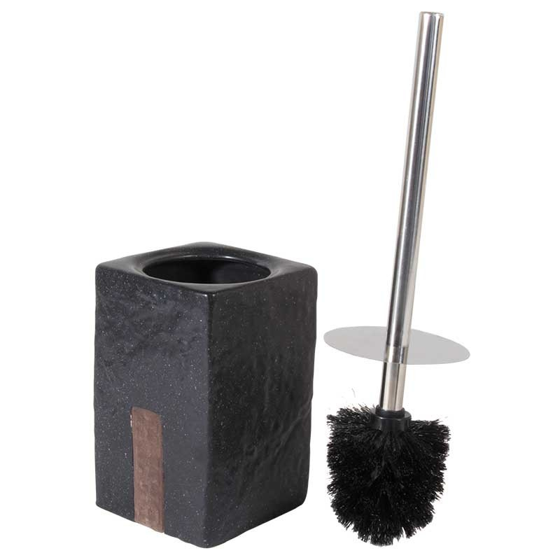 Туалетная щетка состоит из рукоятки из нержавеющей стали, черной щетки с жестким густым ворсом и фарфоровой подставки под щетку.