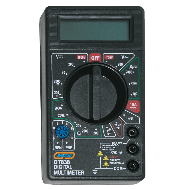 Мультиметр ТЕК DT 838 предназначен для измерений постоянного/переменного напряжения и тока, сопротивления, проверки диодов, транзисторов и звуковой прозвонки. Модель оснащена удобным переключателем режимов работы и пределов. Также стоит отметить высокую чувствительность - 100 мкВ. Изделие широко используется как в домашнем хозяйстве и мастерских, так и в лабораториях.