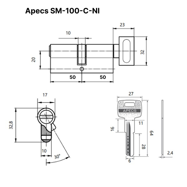 Цилиндровые механизмы Apecs - оптимальное предложение по качеству в сегменте латунных цилиндров, предназначенных для входных дверей. Прошли испытания и сертификацию в России 2 класса согласно ГОСТ 5089-2011. В цилиндровых механизмах Apecs реализована защита от бампинга, манипуляционных методов вскрытия, высверливания. Рекомендации по использованию с другими товарами для установки на входную дверь (приобретаются отдельно): - накладная броненакладка Apecs Protector Basic; - врезная броненакладка Apecs Protector Pro 50. ВАЖНО: при установке цилиндров не использовать электроинструмент.