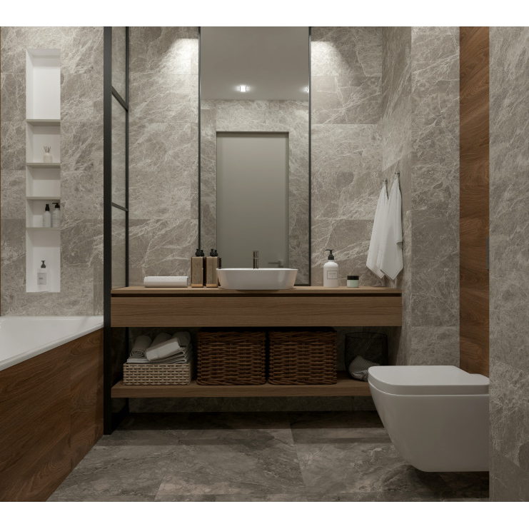 Керамогранит NR103 Mizar Dark Grey 60х60 см подходит для всех типов жилых помещений. Глазурованное покрытие дает сложный и богатый с художественной точки зрения рисунок. Ректифицированный керамогранит можно укладывать с минимальными швами и создавать визуально монолитные поверхности, он эффектно смотрится и прост в уходе.