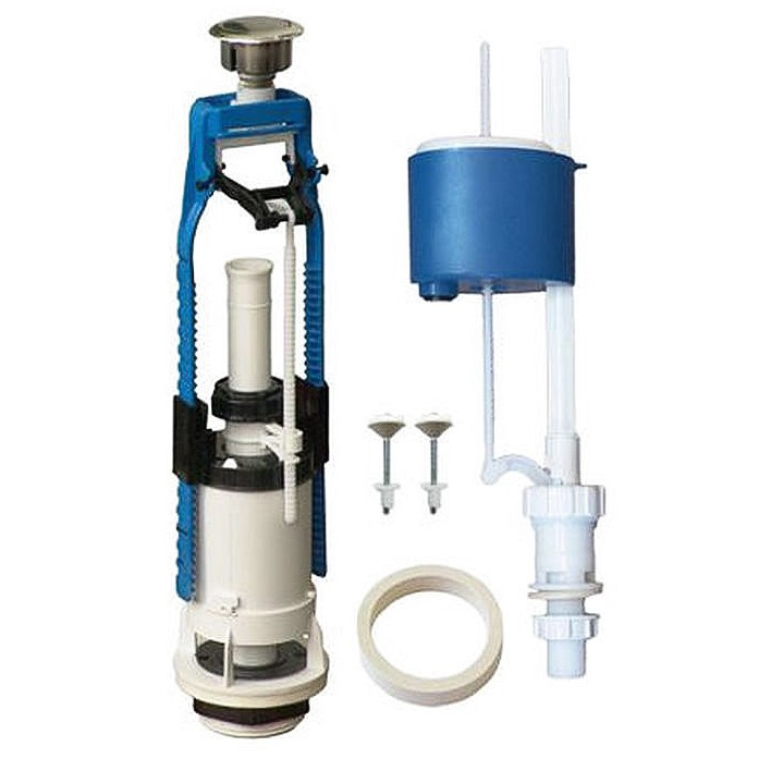 Арматура для сливного бачка кнопка, нижняя подводка, 69.57.14.3 Псков произведена во Пскове и предназначена для организации поступления воды в бачок и ее смыв для очищения чаши унитаза. Состоит из кнопочного сливного механизма с металлизированной кнопкой, а также механизма нижнего подвода воды со штуцером из прочного пластика с резьбой на 1/2" (пол дюйма). Подходит для бачков с отверстием для кнопки в 40 мм.