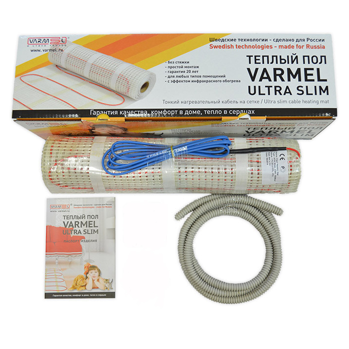Varmel Ultra Slim Twin – система теплого пола на основе двухжильного нагревательного кабеля (мат), который представляет собой ячеистую полимерную сетку основу с закрепленными на ней витками греющего кабеля. Конструкция кабеля состоит из двух греющих жил во фторопластовой изоляции, экрана из медной оплетки и сплошной оболочки из алюминиевой фольги, наружной изоляции с одним монтажным выводом. Преимуществом данного кабеля является то, что обе жилы нагревательные. Это обеспечивает большую площадь и равномерность нагрева. Внешняя оболочка кабеля является самозатухающей.