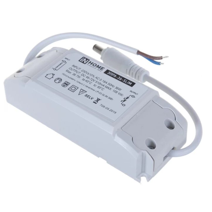 Электронный пускорегулирующий аппарат ЭПРА-36-SLIM серии SLIM In Home применяется с целью преобразования напряжения бытовой сети 230В для запитки и дальнейшей работы светодиодных панелей. Имеет сертификат таможенного союза ТР ТС ЕАС. Корпус драйвера сделан из качественного пластика, который не подвержен деформации и старению. Изделие может использоваться как внутри осветительного прибора, так и вне его. Стандартная степень защиты драйвера позволяет применять его в чистых и сухих помещениях при температурах +1 ... +55°С. Имеет простую и понятную схему подключения, обеспечивающую качественный и быстрый монтаж. Подключение должно осуществляться только квалифицированным персоналом. Перед установкой следует убедиться в наличии автоматического выключателя в цепи.