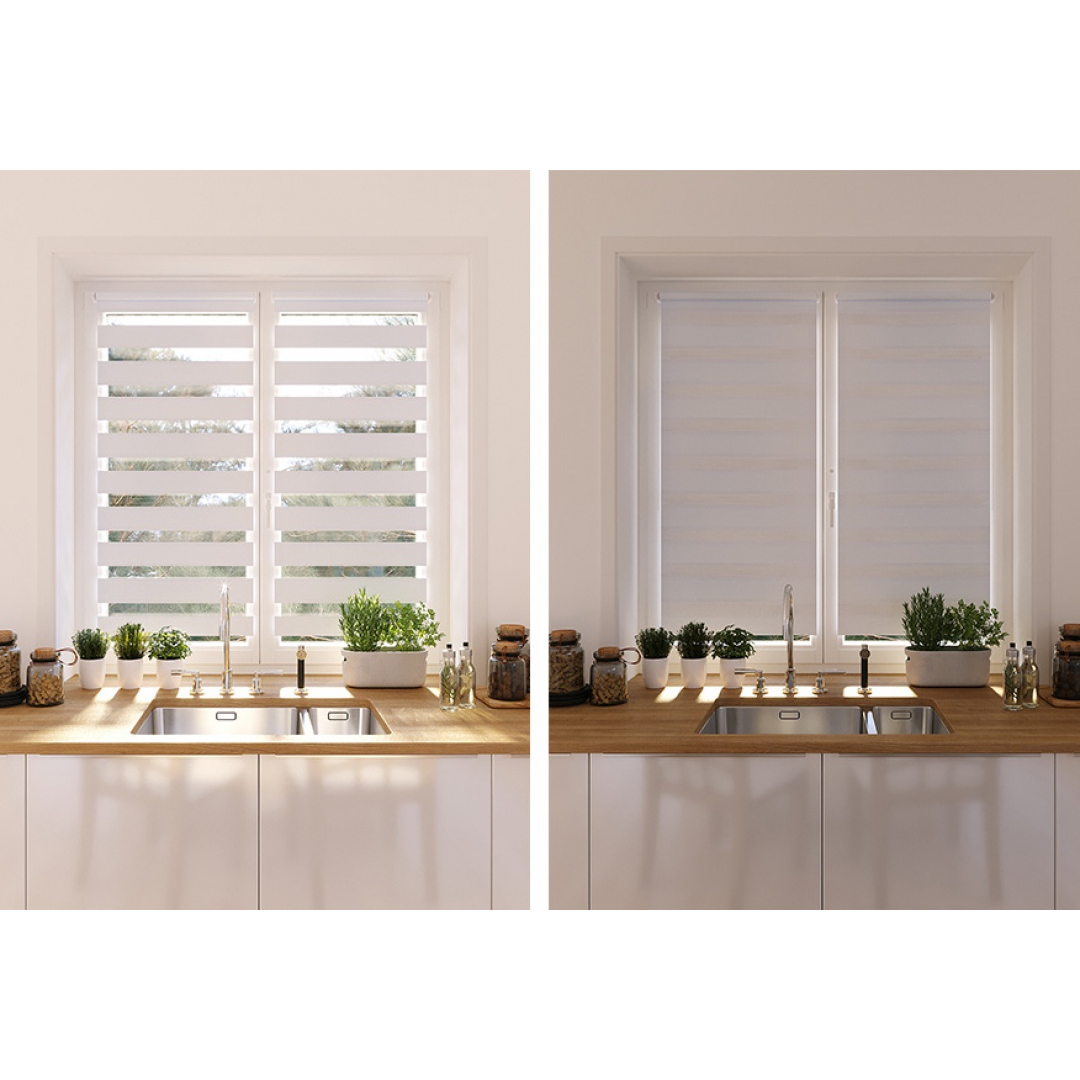 Жалюзи День-Ночь защищают от очень яркого света и бликов днем, и создают уют ночью, при этом жалюзи день-ночь многофункциональны, имеют 2 режима использования: