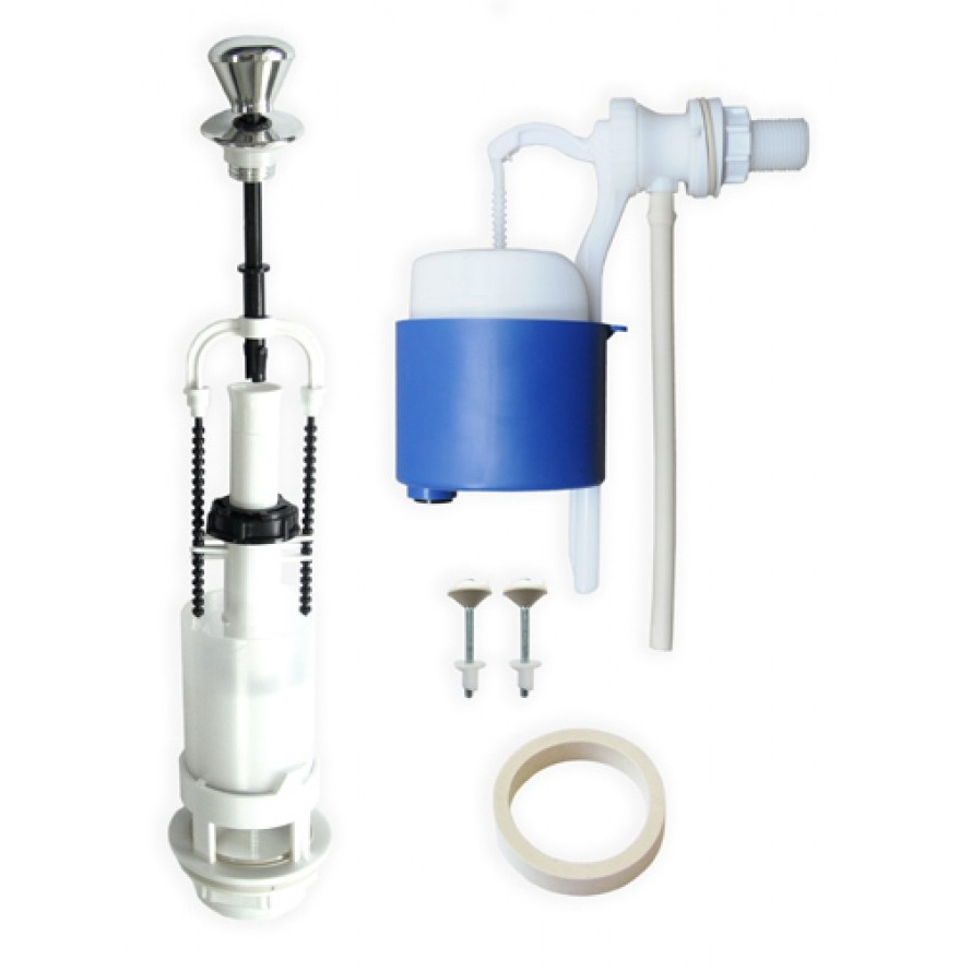 Арматура для сливного бачка шток, боковая подводка 66.54.14.3 Псков произведена во Пскове и предназначена для организации поступления воды в бачок и ее смыв для очищения чаши унитаза. Состоит из сливного механизма со штоковым клапаном с пластиковой кнопкой, а также механизма бокового подвода воды с пластиковой резьбой на 1/2" (пол дюйма). Подходит для бачков с отверстием для кнопки в 25 мм.