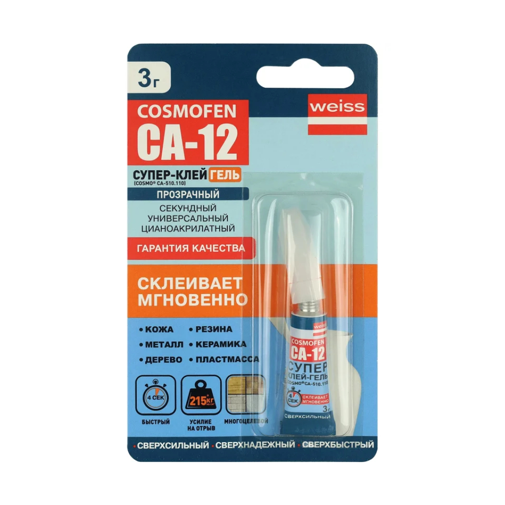 Цианоакрилатный клей Cosmofen CA-12 - секундный супер-быстрый клей, обладает повышенной прочностью. По результатам испытаний клей CА-12 признан лучшим "секундным" клеем в области как бытового, так и промышленного применения! Благодаря своим уникальным характеристикам клей Космофен имеет самый широкий спектр областей применения: в быту - прекрасно склеивает все виды пластика, резину, металл, керамику и стекло, незаменим при проведении сантехнических работ, при производстве рекламной продукции, игрушек, в сфере сервисного обслуживания и ремонта автомобилей. Время выдерживания склеиваемых поверхностей составляет считанные секунды. При застывании супер клей момент образует прозрачную пленку, не заметную для глаз. Не использовать клей для склеивания пористых поверхностей. Клей CA-12 очень практичен и легок в применении.