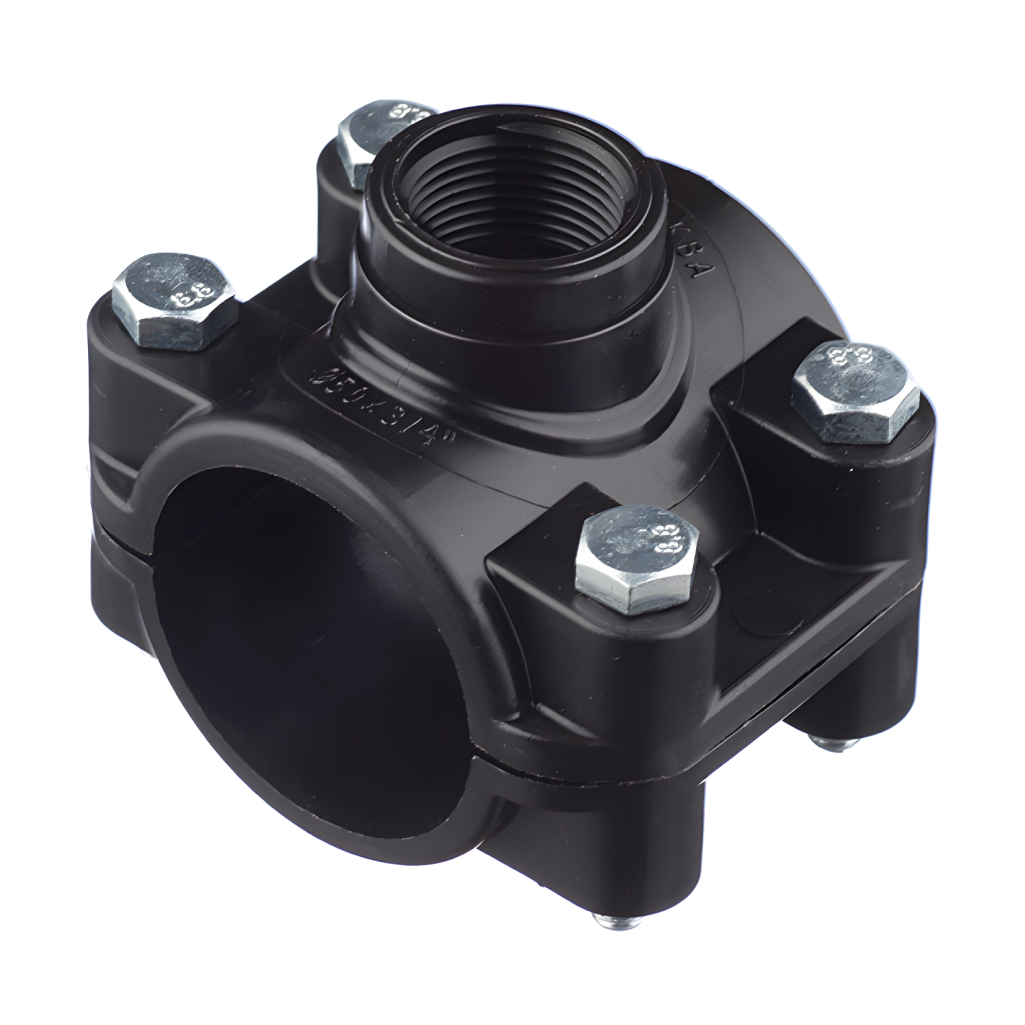 Хомут-врезка ПНД с внутренней резьбой представляет собой разъемное соединения, используется в процессе сборки трубопроводов холодного водоснабжения.