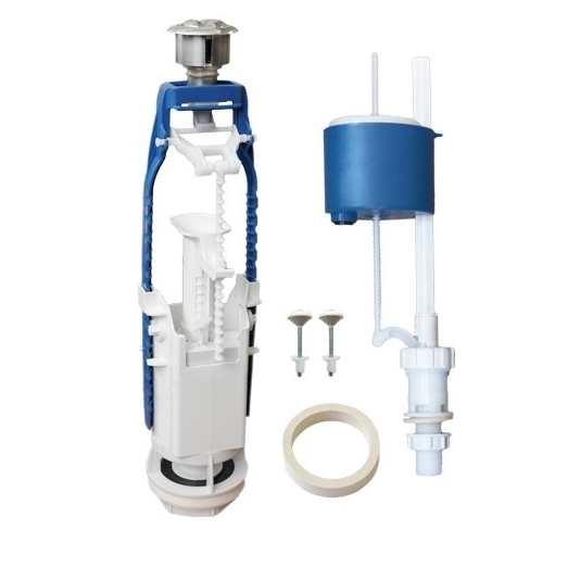 Арматура для сливного бачка 2-х уровневая кнопка, нижняя подводка, произведена во Пскове и предназначена для организации поступления воды в бачок и ее смыв для очищения чаши унитаза. Состоит из кнопочного сливного механизма с металлизированной кнопкой, а также механизма нижнего подвода воды со штуцером из прочного пластика с резьбой на 1/2" (пол дюйма). Подходит для бачков с отверстием для кнопки в 40 мм.