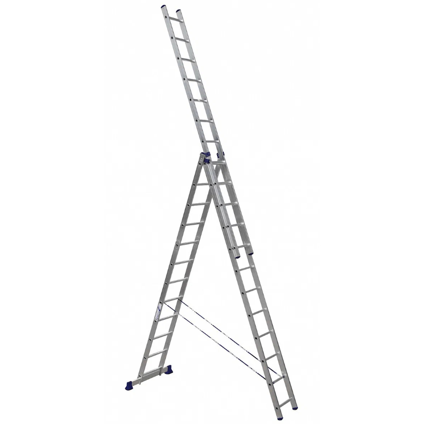 Алюминиевая трехсекционная универсальная лестница. Универсальность данной лестницы заключается в том, что она может использоваться как раздвижная приставная лестница из трех частей и как свободностоящая стремянка (перевернутая русская буква «У»). Третья секция является съемной, и ею можно пользоваться отдельно как приставной лестницей, а оставшаяся часть при этом представляет двухсекционную универсальную лестницу. Необходимый для прочности перехлест второй и третьей секции обеспечивается боковым упором. Вставить третью секцию сверху через верхний соединительный узел и обойти этот упор невозможно.