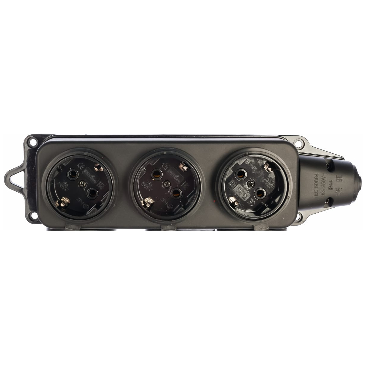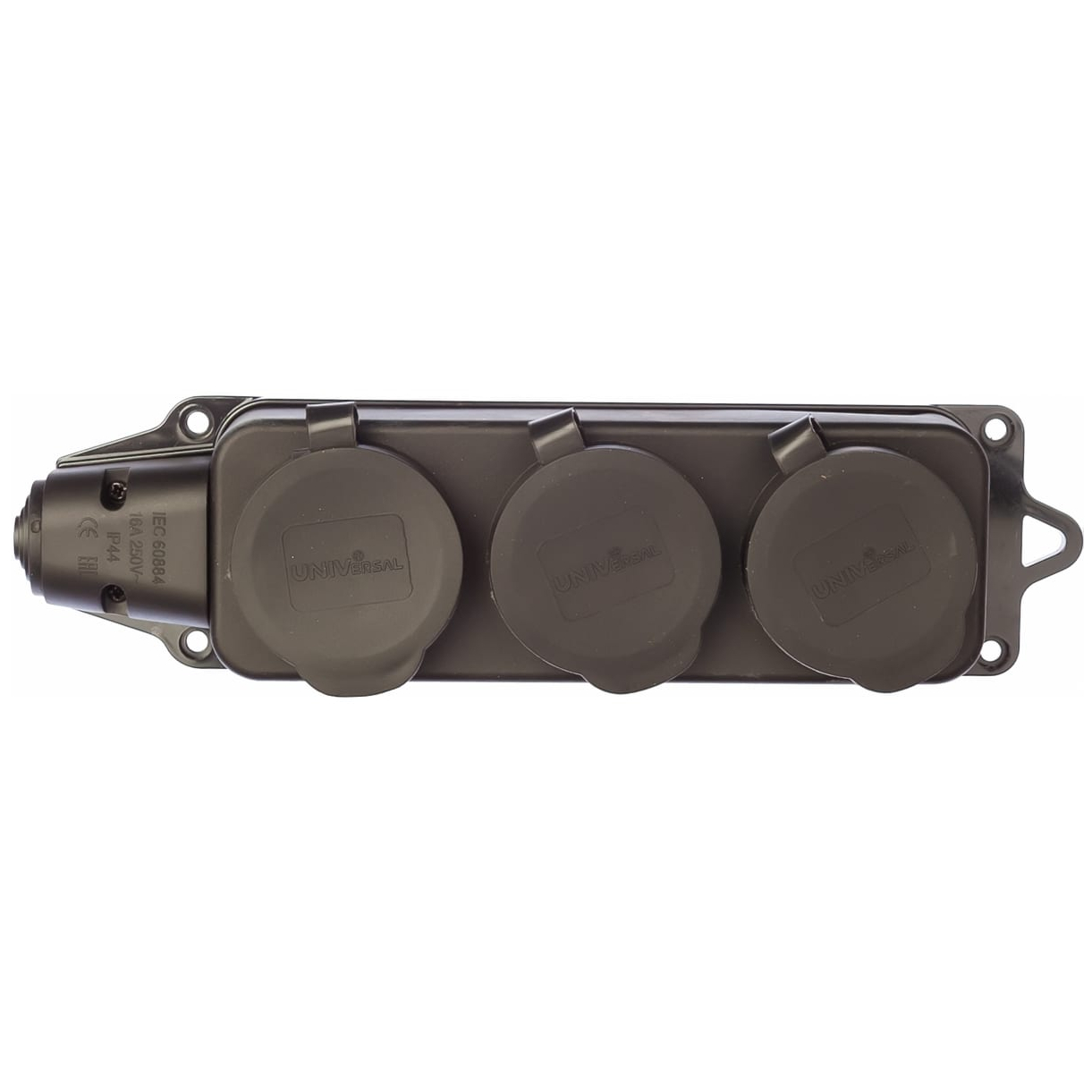Колодка 3 гнезда с заземлением, каучуковая с заглушками, черная, Universal - силовой разъем для создания надежных и защищенных соединений. Изделие дает возможность подключения одновременно трех электроприборов вне помещения, например: строительного оборудования, электроинструмента, приборов электроснабжения и пр.