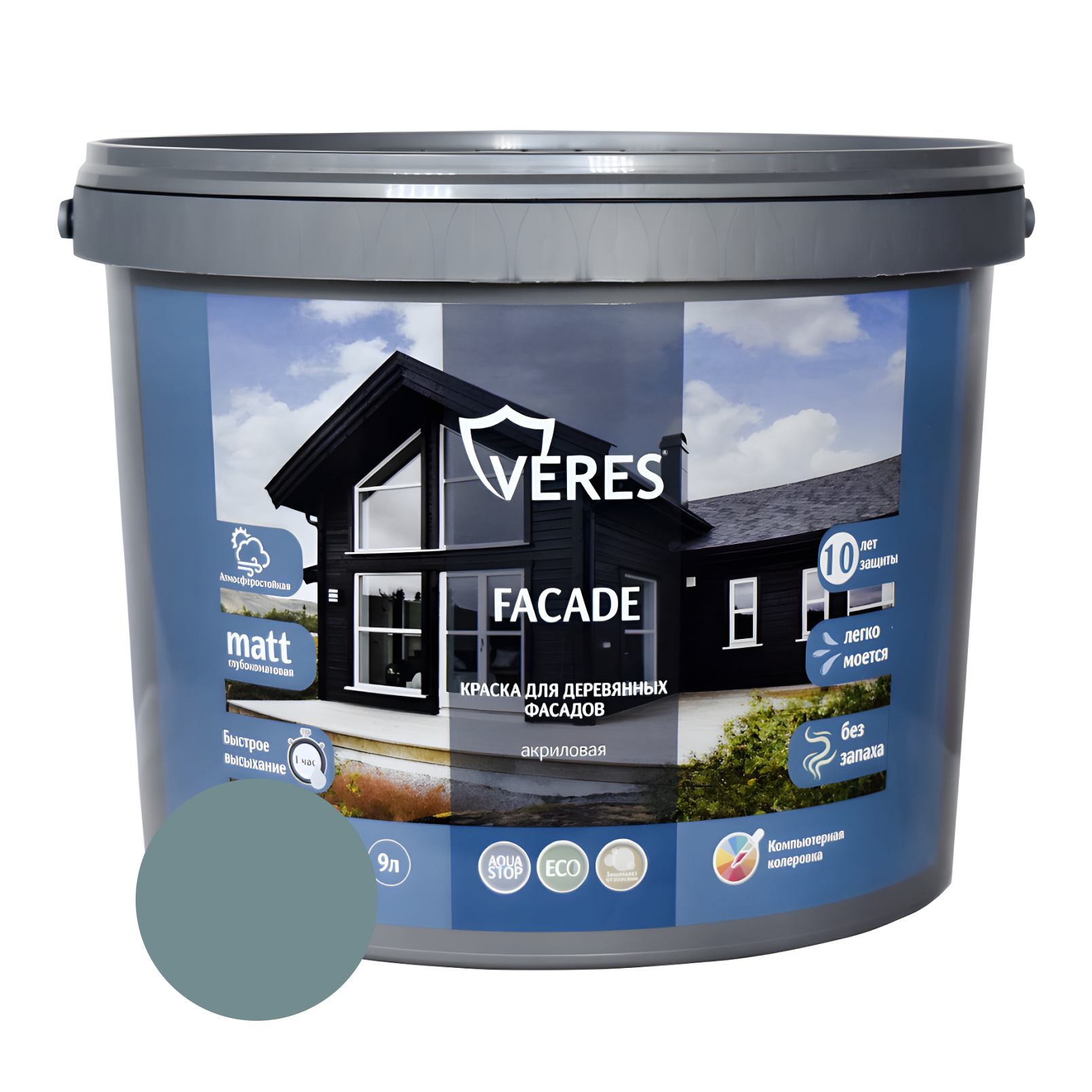 Краска для деревянных фасадов Veres Facade, акриловая, идеальна для зданий - памятников архитектуры. Обладает превосходной адгезией (сцеплением) к штукатурке, шпатлевке, бетону, кирпичу, гипсоволокно, гипсокартону, фанере, дереву, ДСП, ДВП, МДФ, загрунтованному металлу. Выдерживает влажную уборку с применением неабразивных моющих средств. Содержит антисептик.