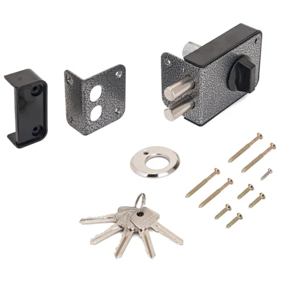 Замок накладной цилиндровый с вертушкой. Предназначен для установки на деревянные двери. Засов из двух цилиндрических ригелей диаметром 14 мм, с максимальным вылетом 30 мм. Удаление ключевого отверстия - 60 мм. Габариты замка - 100х75х25 мм. Комплектация - 5 ключей, запорная планка, накладка. Механизм замка под англ. ключ, идет совместно с корпусом. Закрывание и открывание замка изнутри производится вертушкой, снаружи ключом.