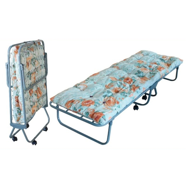 Кровать-тумба раскладная КТР-1. Купив эту раскладушку, можно не думать о матрасе. Мягкий матрас с пышной набивкой уже входит в комплект. Осталось постелить постельное бельё и можно ложиться отдыхать. Кровать быстро раскладывается и складывается. Для удобства потребителей кровать снабжена шаровыми опорами (мебельные колёса). В сложенном виде она компактна и не займёт много места при хранении или транспортировке. Каркас изделия выполнен из стальной трубы диаметром 22 мм её стенки обеспечивают прочность и лёгкость кровати-раскладушки. На раме каркаса натянуто металлическое плетение виде пружины «змейка». Спальное место ватный матрас. Таким образом, эта модель кровати-раскладушки вполне мягкая и по этому показателю не уступает стандартной кровати.