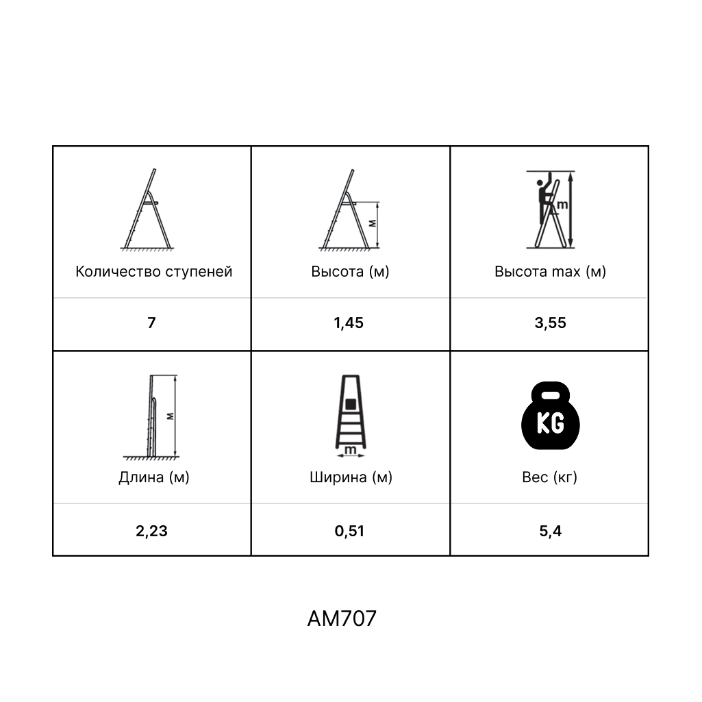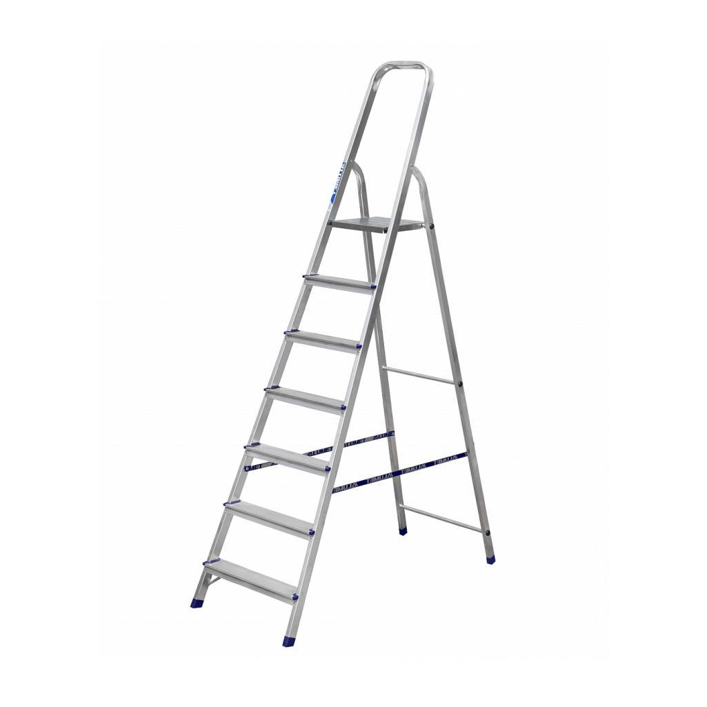 Стремянка алюминиевая изготовлена из высокопрочного алюминиевого профиля. Задняя и передняя нога соединены между собой. Рабочая площадка выполнена из оцинкованной стали. Ступени имеют рифленую поверхность. Башмаки изготовлены из высокопрочного пластика. Стремянка в рабочем положении надежно фиксируется рабочей площадкой, а начиная с пятиступенчатой и выше страховочными ремнями. Количество ступеней от 3-х до 10-и. Стремянка алюминиевая серии АМ предназначена для проведения различных видов работ на высоте до 4 м как в быту, так и на производстве.