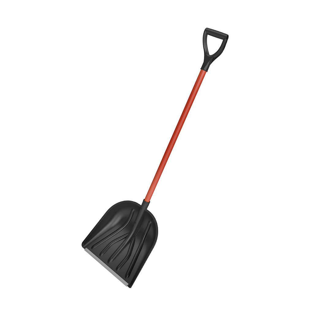 Морозостойкая пластиковая лопата с оцинкованной планкой и улучшенной эргономической V-образной ручкой на алюминиевом черенке с нанесенным защитным покрытием.
