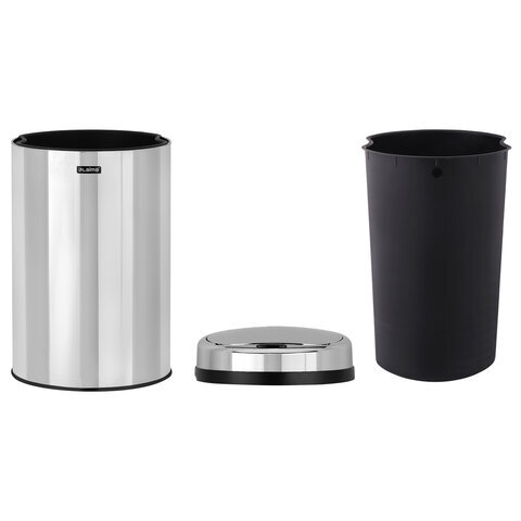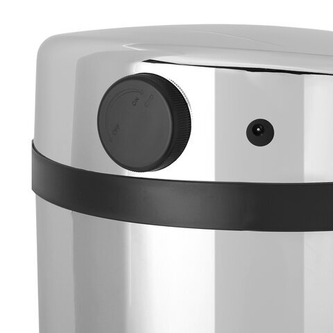 Ведро для мусора изготовлено из нержавеющей стали, обладающей высокой устойчивостью к коррозии и износостойкостью. Поверхность ведра и крышки - зеркальная. Крышка с хромированным покрытием выполнена из прочного ABS пластика. Крышка имеет два режима открывания - бесконтактный (сенсорный) и ручной (при помощи кнопки). Оба режима открывания срабатывают только при наличии 4-х заряженных батареек типа АА, помещенных в специальный отсек для батареек, расположенный в крышке снаружи. Батарейки в комплект не входят.