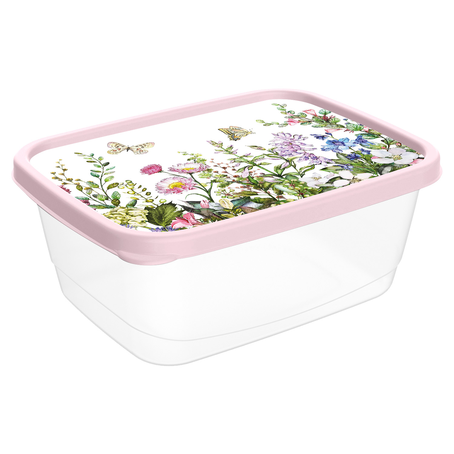 Контейнер для продуктов 1,5л прямоугольный с декором "Цветущий луг" (светло-розовый)