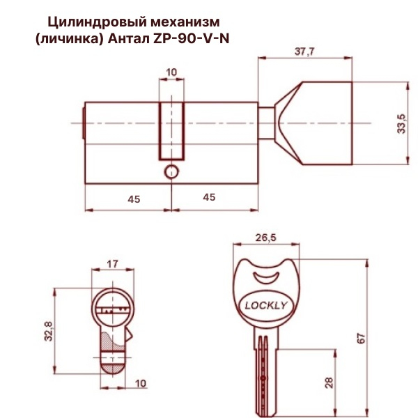 Цилиндровый механизм Антал ZP-90-V-N с хромированным покрытием для врезных замков, тип «ключ-вертушка», оснащён пятью перфорированными ключами.