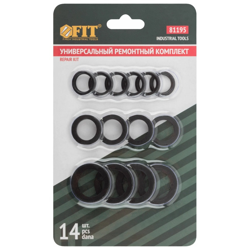 Универсальный ремонтный комплект FIT включает 14 предметов, предназначенных для ремонта пневматического оборудования. В набор входят различные размеры уплотнительных колец: 2,5 х 10 х 16 мм (6 шт), 3 х 13 х 19 мм (4 шт) и 3 х 17 х 25 мм (4 шт).
