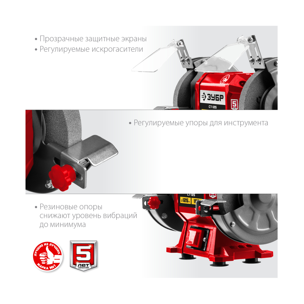 Станок заточной ЗУБР СТ-125 – незаменимый инструмент для гаража, мастерской и используемый для заточки и сухой шлифовки металлических заготовок и режущего инструмента. Простота конструкции, высокая надежность, компактный размер, два камня с разной зернистостью – все что нужно для настоящего мастера, ценяще-го качество и рассчитывающего на долгий срок службы.