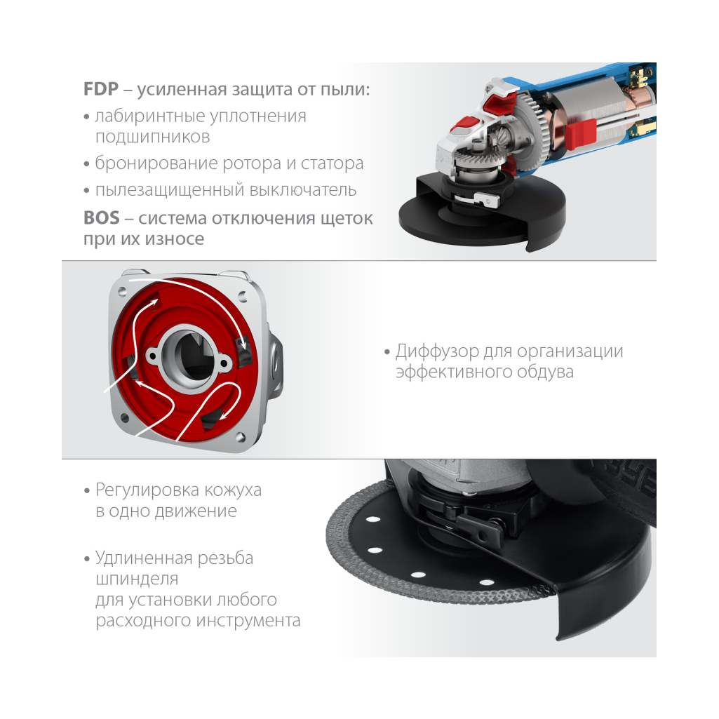 УШМ увеличенной мощности при сохранении компактных размеров. Сочетание диска 125 мм и мощности двигателя отлично подходит для всех видов работ - резки металла, кирпича, керамики, зачистки и шлифовки. Простота конструкции и усиленная пылезащита всех узлов гарантирует долгий срок службы даже при самых суровых условиях эксплуатации. Для зачистки, шлифовки и резки металлов, резки бетона и камня при установке соответствующих шлифовальных, отрезных, алмазных кругов.