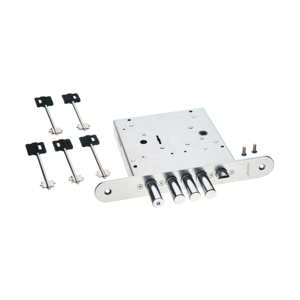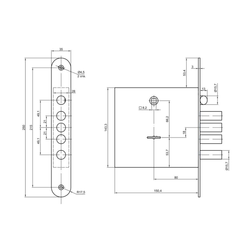 Универсальный врезной 8-сувальдный замок под ручку, овальная лицевая планка, 4 ригеля, защелка.