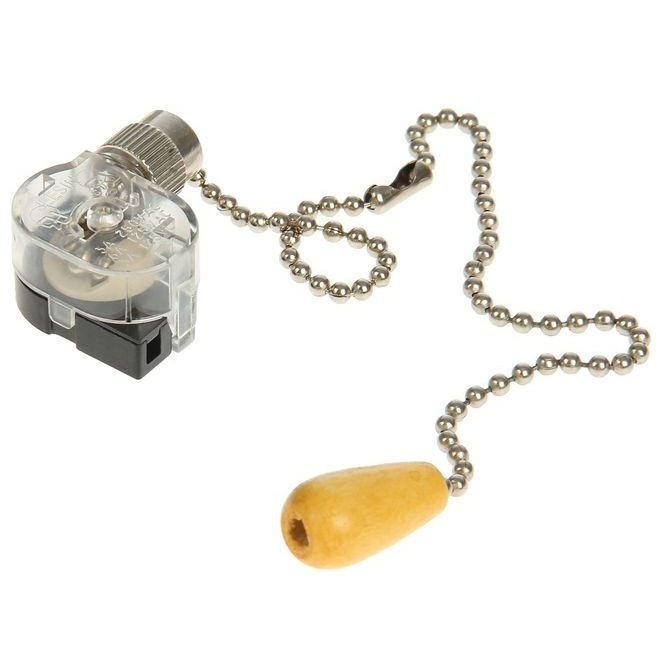 Выключатель для настенного светильника с хромированной цепочкой и деревянным наконечником.