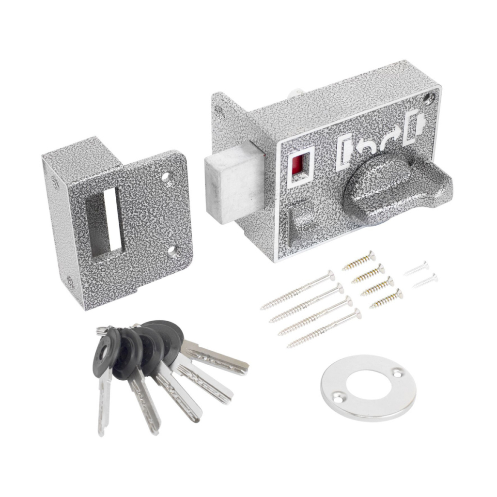 Замок накладной цилиндровый с прямым ригелем. Предназначен для установки на деревянные двери толщиной до 40 мм. Устанавливается в жилых помещениях на левые и правые двери. В комплекте - 5 перфорированных ключей, запорная планка, накладка. Закрывание и открывание замка изнутри производится вертушкой, снаружи ключом. Имеет возможность ночной фиксации засова изнутри.