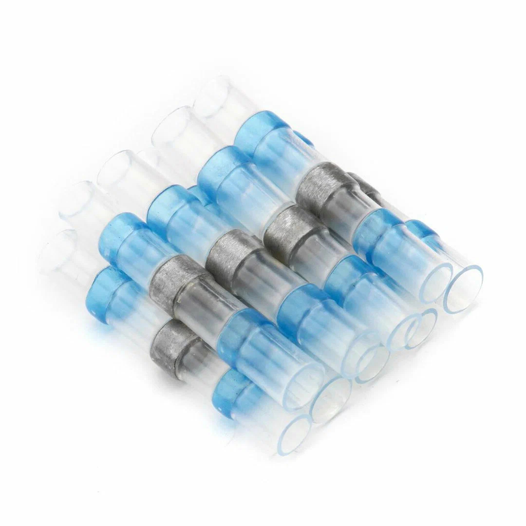 Термоусаживаемые гильзы с припоем используются для соединения проводов. Соединение происходит при нагревании оловянного припоя в центре трубки строительным феном, кроме этого, сама прозрачная трубка усаживается при нагревании, а цветные кольца с термоклеем дополнительно фиксируют провод внутри трубки.