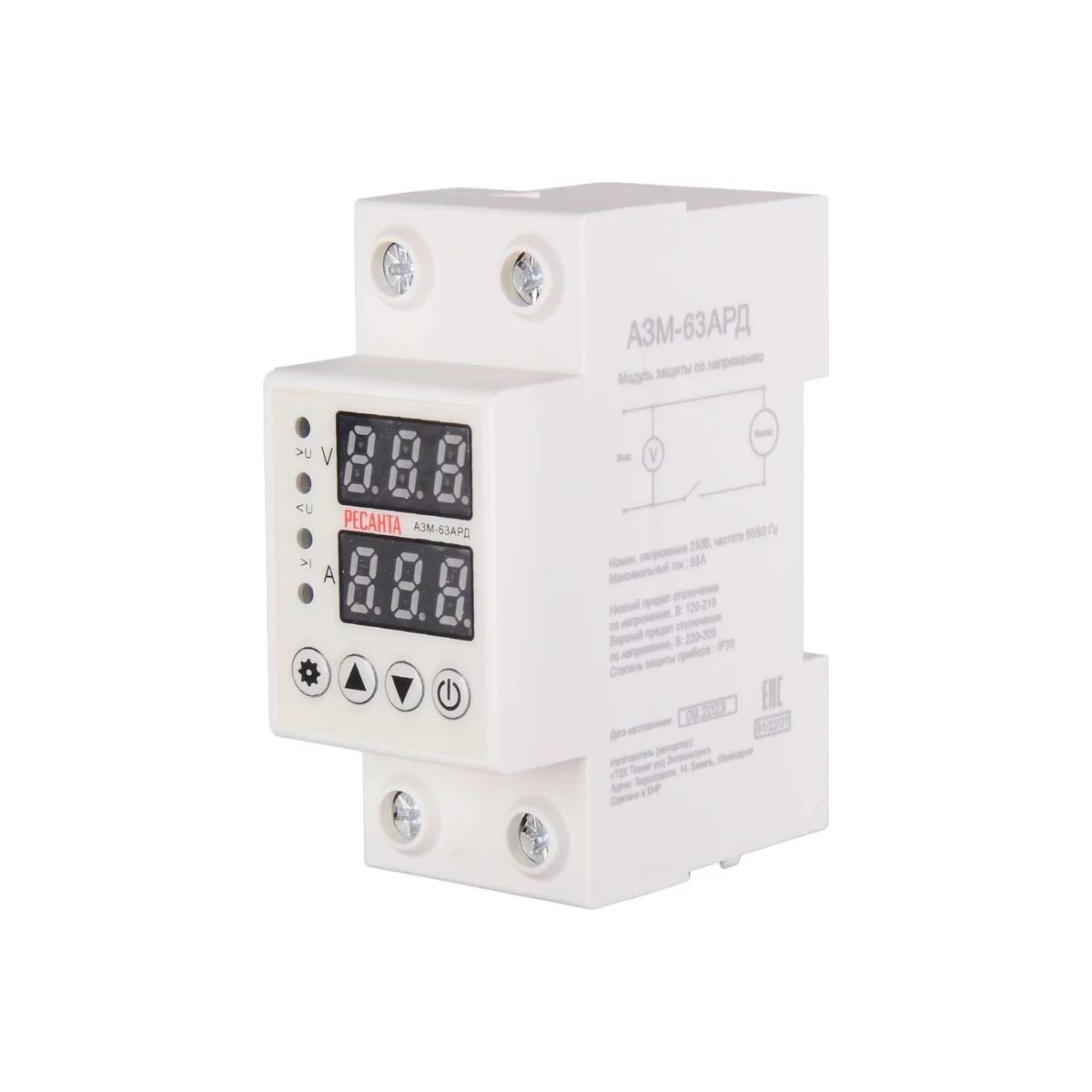 Блок защиты по напряжению Ресанта АЗМ-63АРД - автоматическое устройство защиты от повышенного/пониженного напряжения, в основном используемое для низковольтных распределительных линий для бытовых и аналогичных целей, автоматически обнаруживает сбой, связанный с повышением или понижением напряжения, и отключается, при восстановлении нормальных условий на линии, автоматически включается.