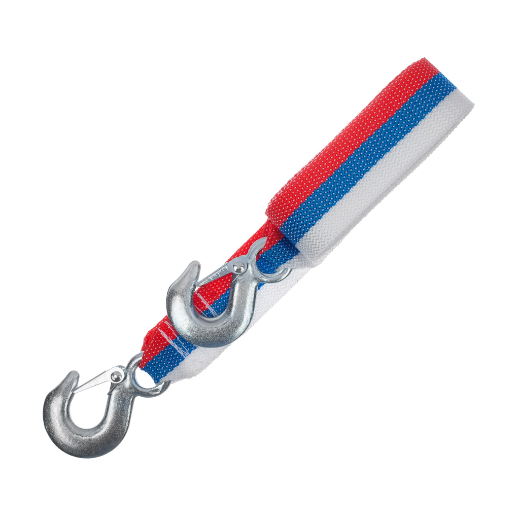 Трос буксировочный имеет два металлических цельнолитых крюка, длина ленты - 5м. Лента выполнена из высококачественного морозостойкого авиационного капрона. Предназначен для буксировки автомобилей и других транспортных средств.