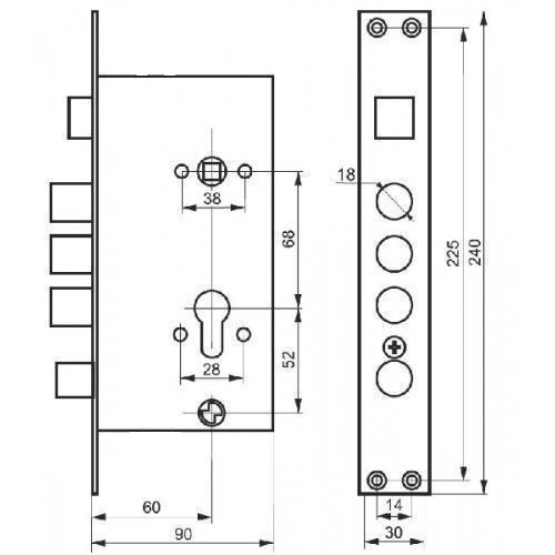 Корпус замка для китайской двери врезной цилиндровый, без цилиндра, без тяг и с задвижкой. Подходит на левые и правые двери. Защелка замка реверсивная (можно развернуть на любую сторону, без разбора корпуса).