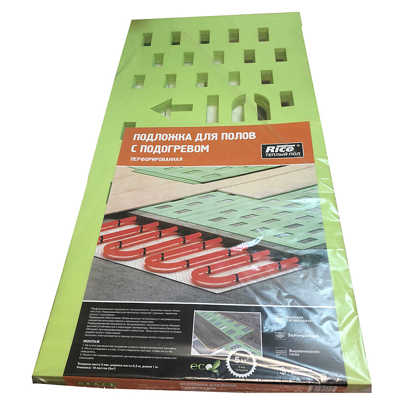 Перфорированная подложка из экструзионного пенополистирола толщиной 3 мм. Предназначена для напольных покрытий (ламинат, паркетная доска) с подогревом. Перфорация обеспечивает более высокую теплоотдачу от нагревательных элементов непосредственно к напольным покрытиям. Перфорированная подложка из экструзионного пенополистирола обладает высокой устойчивостью к перепадам температуры. Экологически безопасна. Обладает противодефомирующей стойкостью. Легко монтируется со всеми видами полов с подогревом. Экономит электроэнергию в период эксплуатации полов с подогревом.
