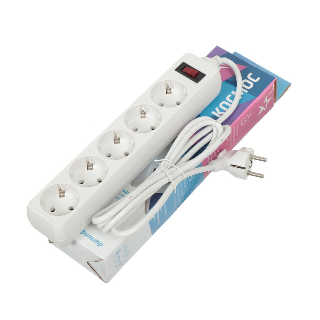 Сетевой фильтр Космос 5 гнезд 3 м с заземлением с выключателем, белый