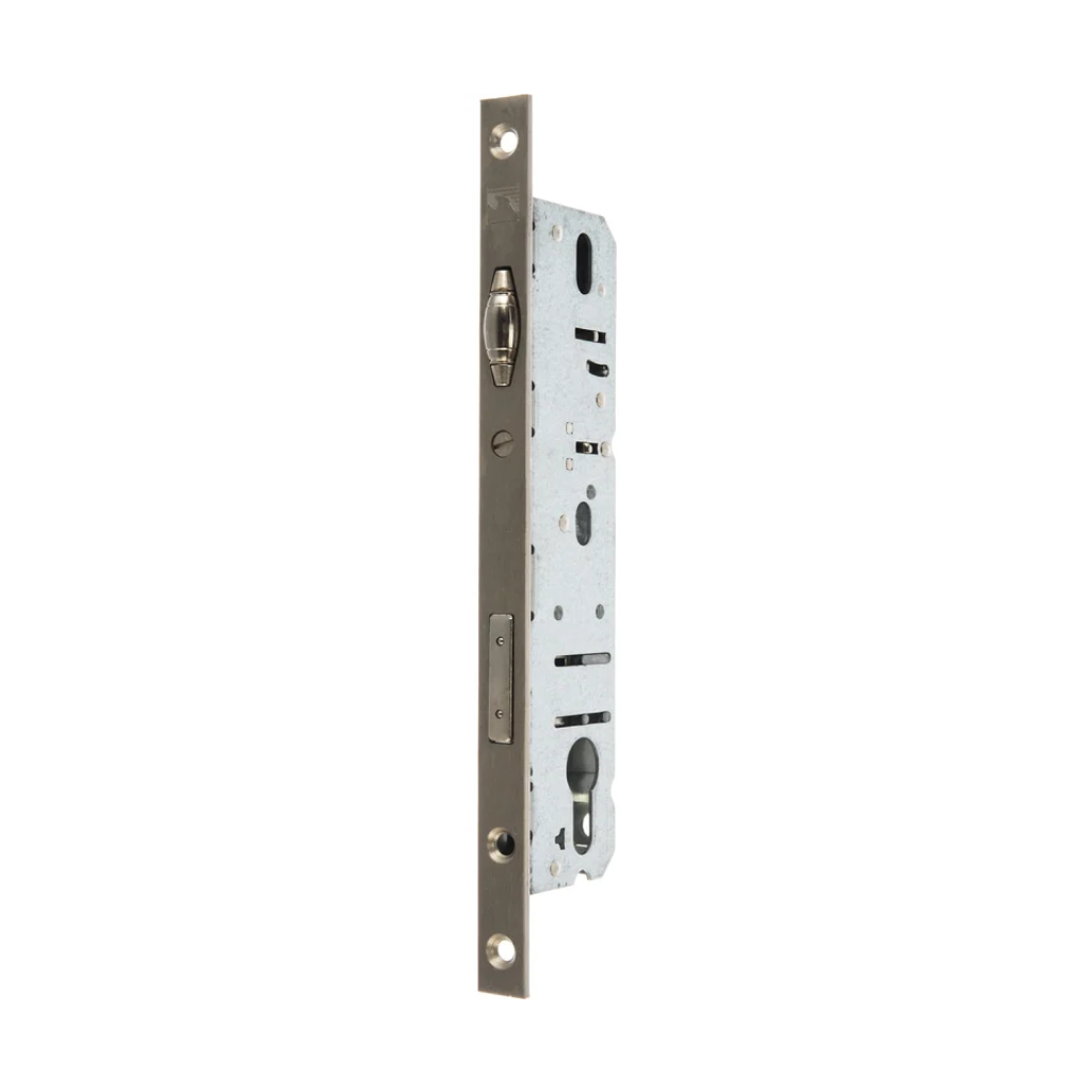 Врезные замки для дверей из ПВХ профиля. Ассортимент представлен моделями с роликовым фиксатором (индекс "R") и моделями под ручку с фалевой защелкой. Замки имеют сертификат соответствия согласно ГОСТ 5089-2011. Замки не комплектуются ответной планкой. Удаление ключевого отверстия (Backset): 25, 30, 35, 40 и 45 мм. В корпусах с Backset 35, 40, 45 мм имеются отверстия для крепления раздельных ручек стяжными винтами, посадочный размер 38 мм.