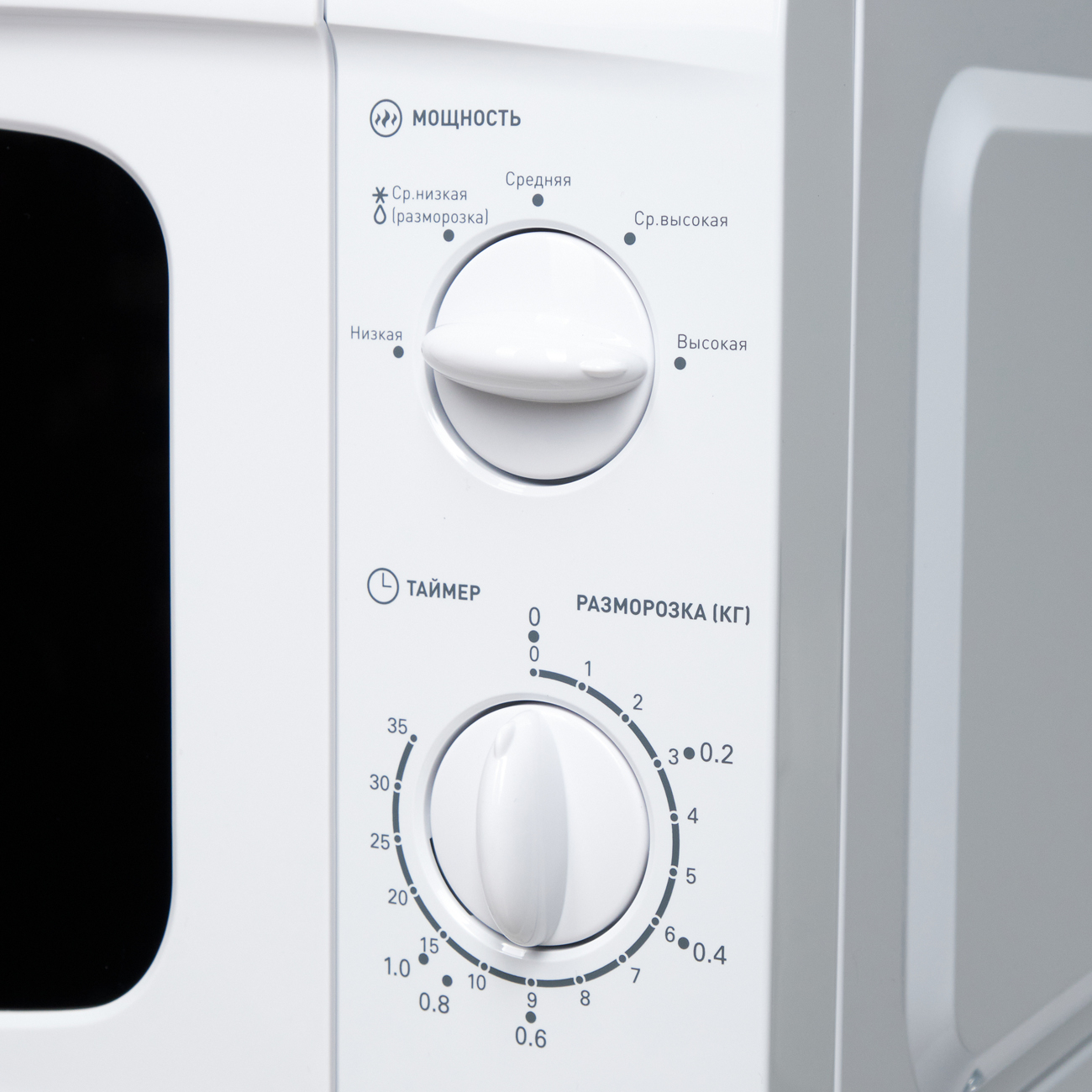 Механическое управление позволяет в одно движение выбрать время работы и включить устройство. Функция разморозки будет полезна, если нужно быстро довести продукт до пригодного для приготовления состояния. Строгие черты идеально впишутся в современный дизайн, будь то кухня или рабочий кабинет.
