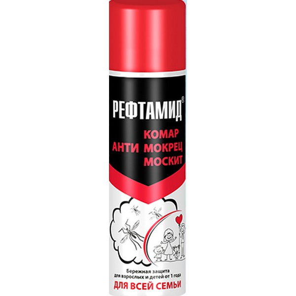 Аэрозоль (репеллентный) от комаров Рефтамид «Для Всей Семьи» предназначен для защиты людей, в том числе и детей от 1 года от кровососущих насекомых (комаров, мошек, слепней, мокрецов) при нанесении на открытые части тела и на одежду.