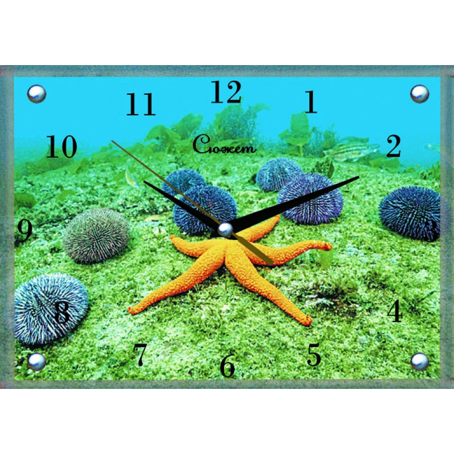 Настенные часы модели В1451 имеют прямоугольную форму размером 25×35 см. Их оформление выполнено методом фотопечати: изображение морского дна с морской звездой и несколькими морскими ежами.Это позволяет создать атмосферу спокойствия и гармонии природы прямо в вашем доме или офисе. Благодаря качественному исполнению картинки цвета остаются насыщенными даже спустя длительное время эксплуатации часов.Поверхность часов защищена прозрачным стеклянным покрытием, обеспечивающим дополнительную защиту от повреждений и загрязнений.