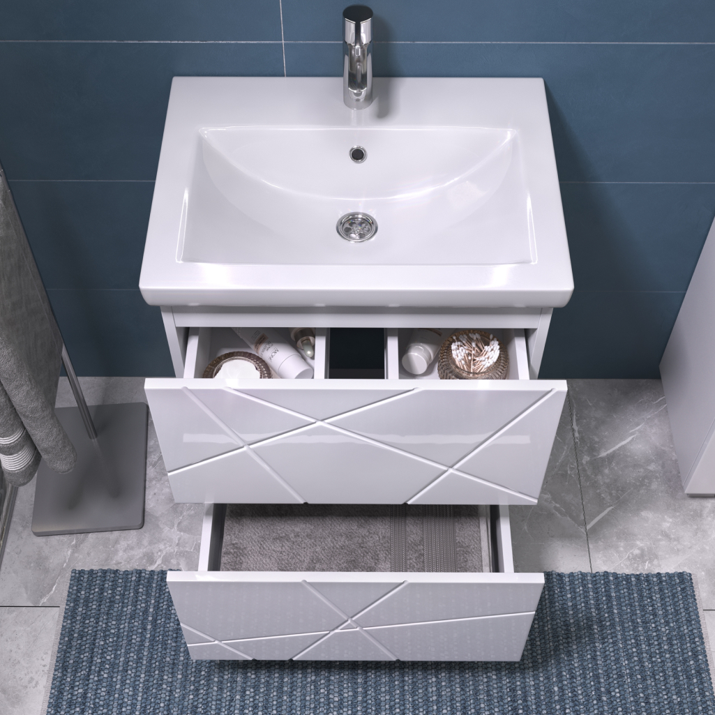 - Просторные ящики: Два вместительных выдвижных ящика позволяют удобно организовать хранение банных принадлежностей, косметики, полотенец и бытовой химии, скрывая их от посторонних глаз