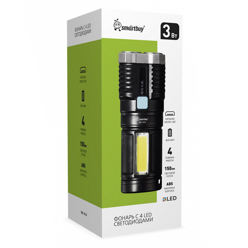 Фонарь Smartbuy SBF-816 — это ручной аккумуляторный фонарь с боковым расположением COB-светодиодов и рассеивателем. Модель оснащена встроенным аккумулятором и заряжается через MicroUSB.