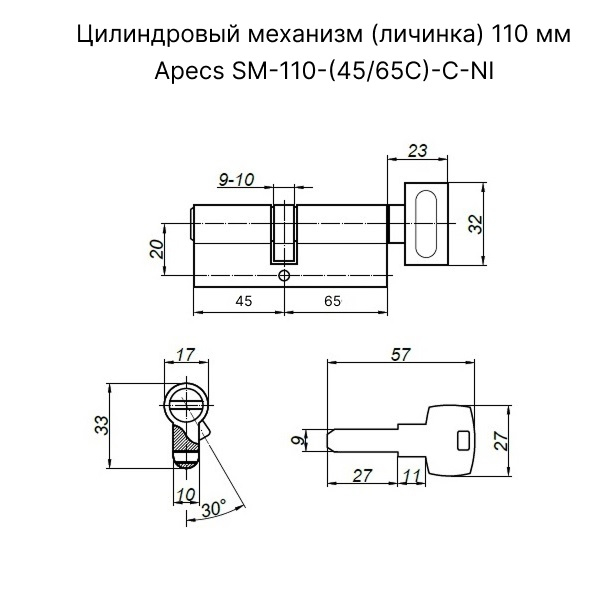 Цилиндровый механизм Apecs SM-110(45/65С)-C-NI — это латунный цилиндр для входных дверей, который прошёл сертификацию в России по ГОСТ 5089-2011 (2 класс). Он обеспечивает защиту от бампинга, манипуляционных методов вскрытия и высверливания.